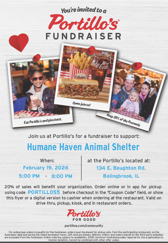 20% of sales will be donated to Humane Haven Animal Shelter when you mention this fundraiser (drive-thru or in restaurant) or when you order using code PORTILLOS5 (online or with the app).